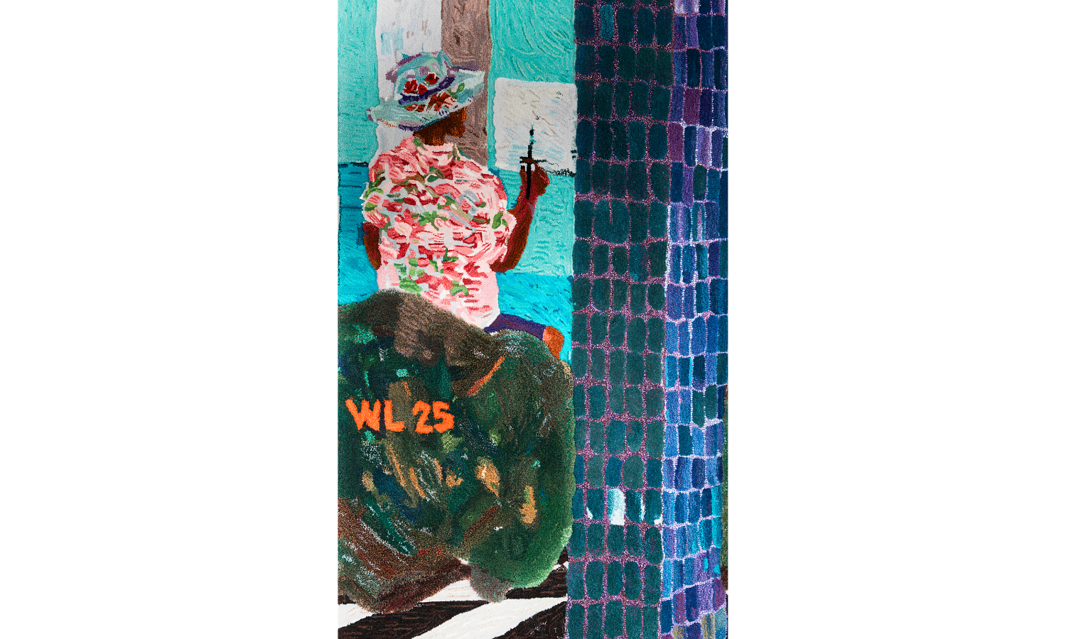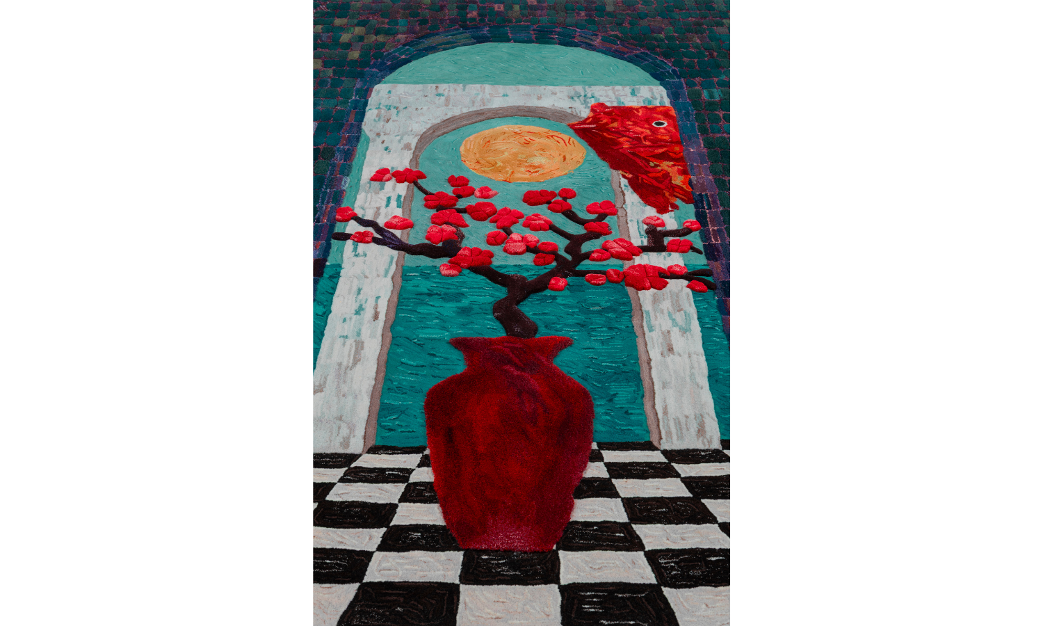 The installation is designed to be a spatial extension of the artist’s work, centred upon a 3M x 4.3M hand-tufted wall tapestry. This piece is a meticulous translation of Lim’s original oil-on-canvas painting into a rich textile medium. The experience is further enhanced by a hand-tufted floor carpet featuring a monochromatic checkered motif, which extends the visual narrative of the tapestry into the physical environment.