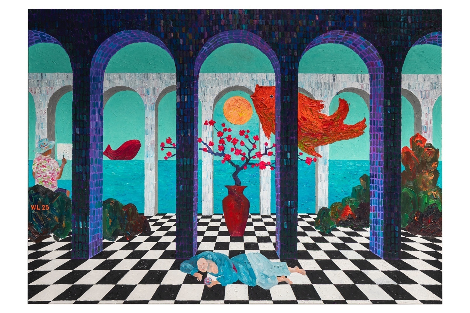 The painting, part of Lim’s Journey series, depicts a boy gazing into a crystal ball, imagining a world where fish leap across the sky and the moon hangs low, a hopeful meditation on perspective, symbolism and the meeting of reality and imagination. The installation brings the painting to life through symbolic motifs and decorative objects, offering a sanctuary where visitors are invited to inhabit a future bright with possibility.