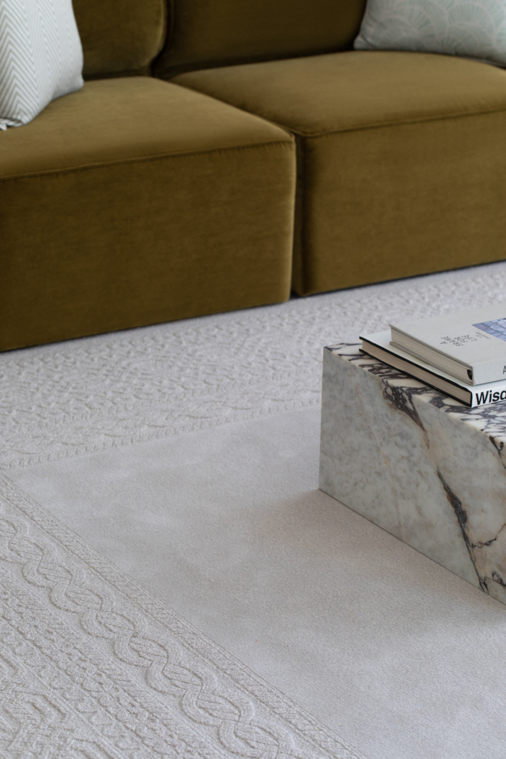 Kara is designed in a cozy beige tone and a rectangular shape, reminiscent of intricately knitted sweaters. It features unique techniques such as cut-and-loop textures and varying pile heights, creating a three-dimensional woven masterpiece for the floor.