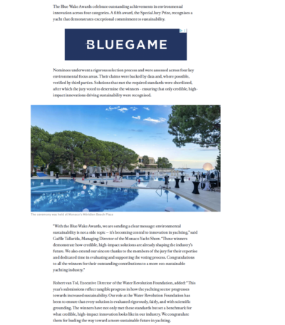 Boat International highlights the celebration of the winners of the Monaco Yacht Show new sustainability initiative: Blue Wake. The event welcomed over 400 guests, including Monaco officials, Blue Wake programme exhibitors, leading sponsors, private clients, and prominent figures from the yachting industry.