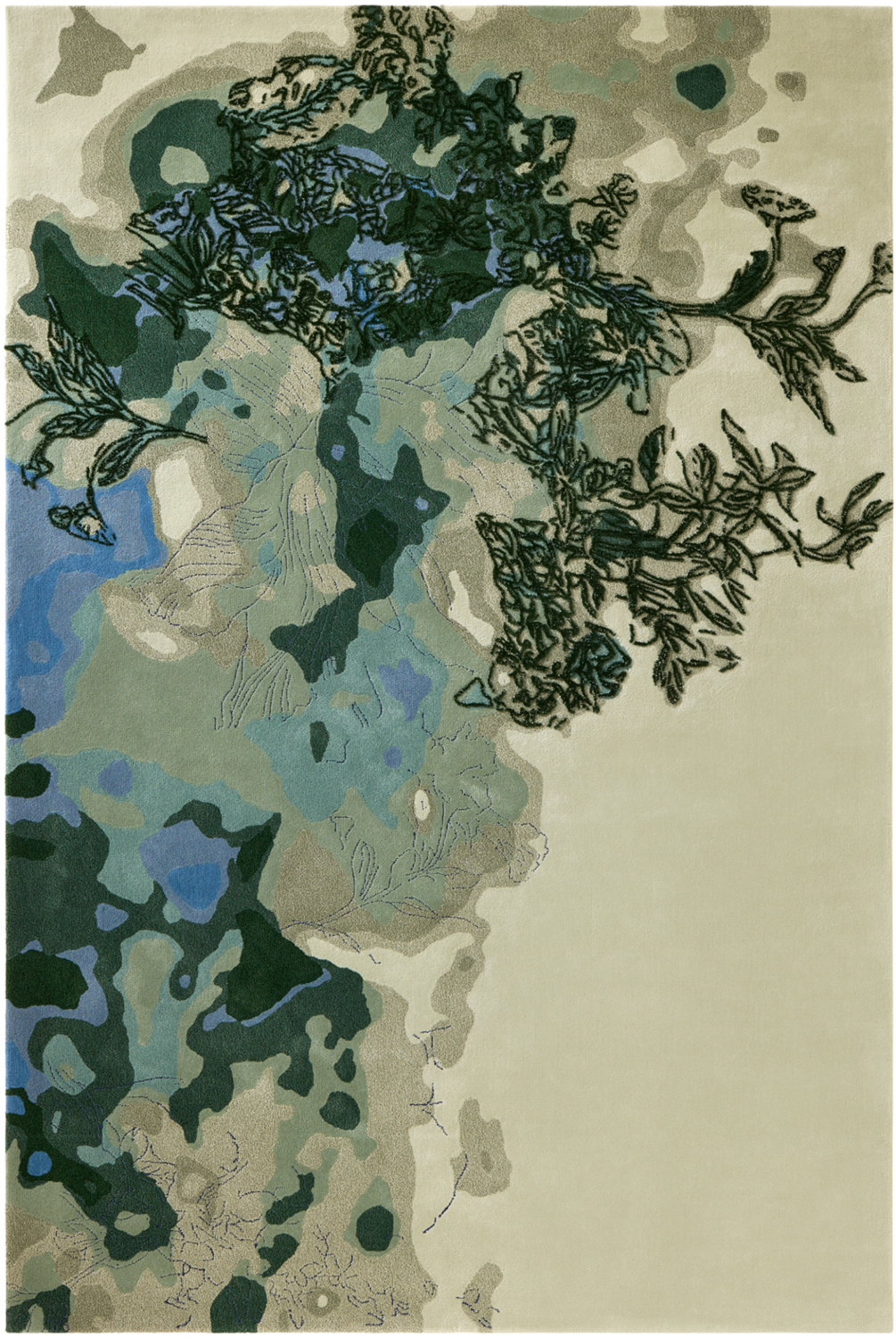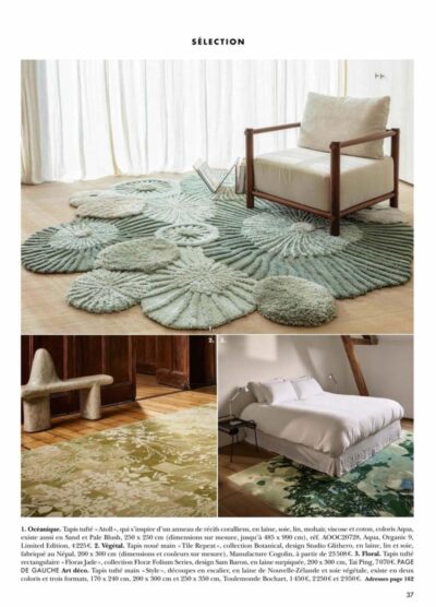 Côté Paris presents the Floras Jade rug from the Florae Folium Series by Sam Baron. The design evokes a lush bouquet, with monochrome linework reminiscent of engraving, unfolds across the surface of the rug in a tone-on-tone harmony of greens, made of New Zealand wool.