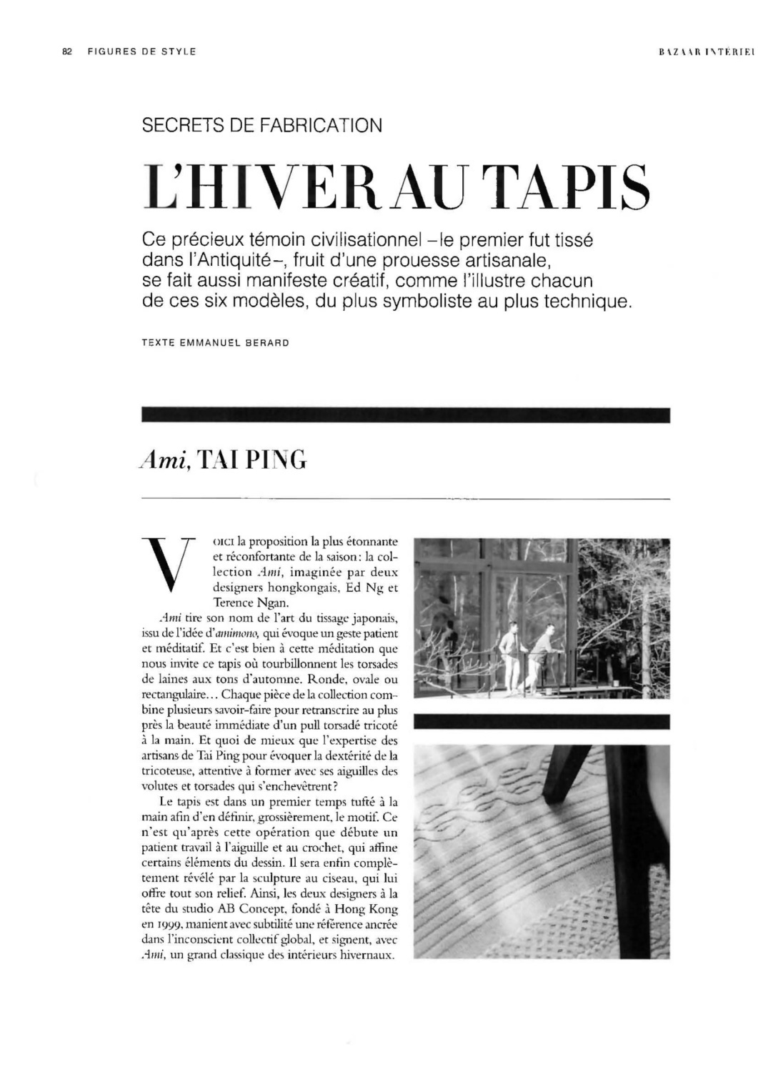 Harper's Bazaar France reports on the Ami collection by AB Concept and in particular about the artisanship placed in the hand manufacturing of the rugs.