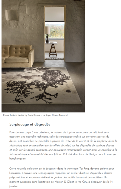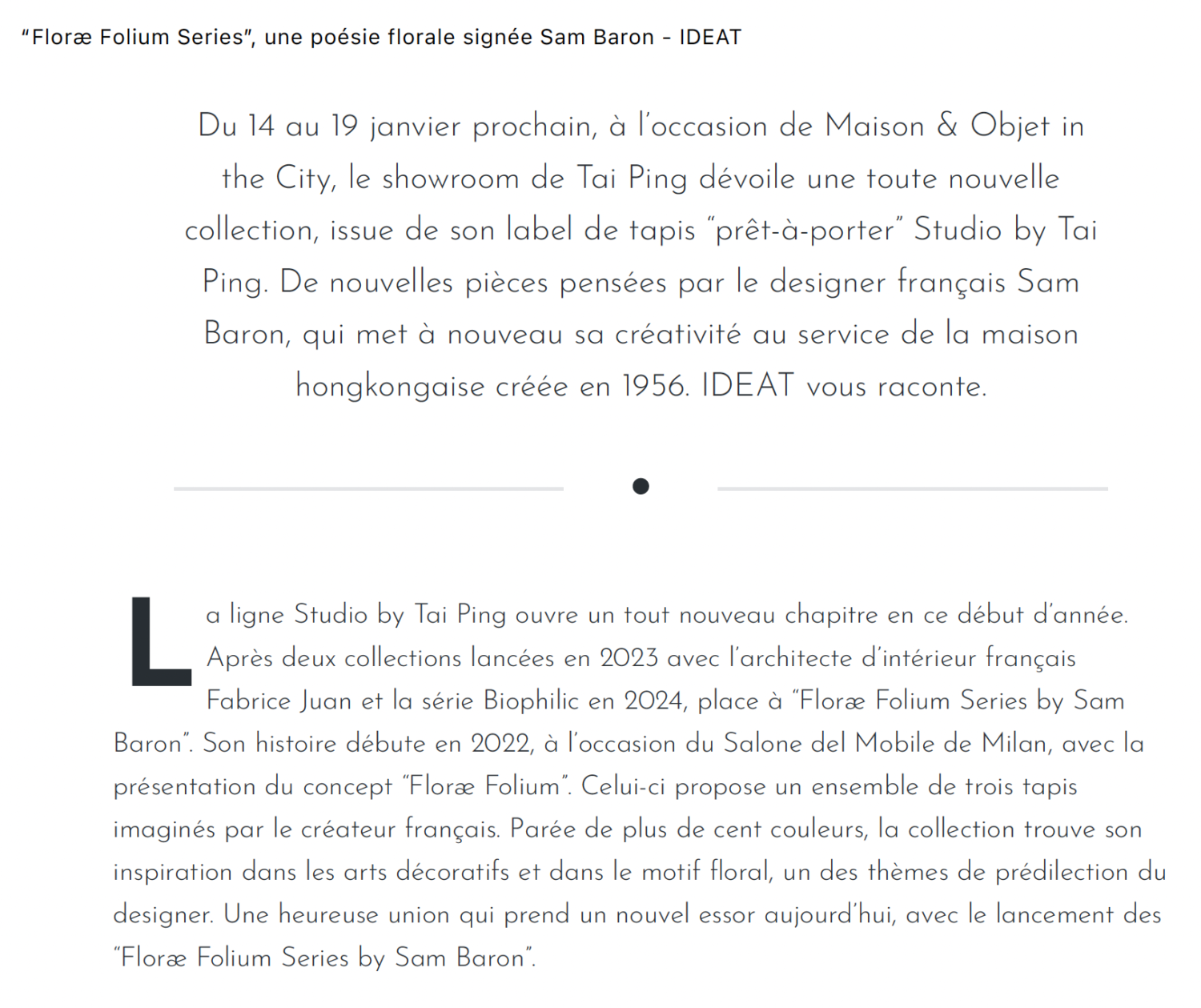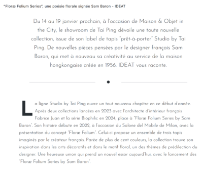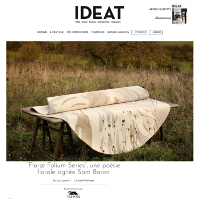 Ideat presents Florae Folium Series by Sam Baron. Launched during Maison & Objet in the City 2026, the collection showcases ten pieces created by the French designer, featuring motifs that evoke petals, foliage, and pistils, in an elegant color palette.